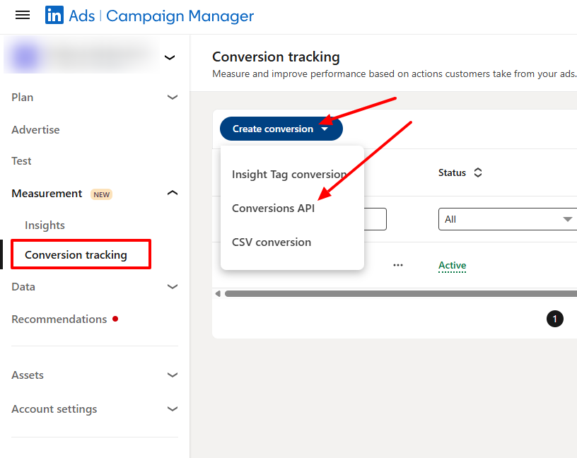 1. In your ad account in Campaign Manager, click on Measurement on the left menu, then click Conversion tracking.