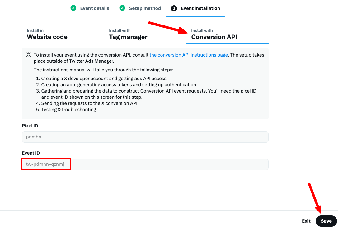 - Select "Install with Conversion API", copy the Event ID, and click Save.