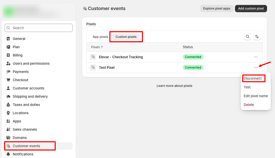 Finally, check Settings > Customer events for any Custom Pixels connected. Disconnect the pixel you need to remove.