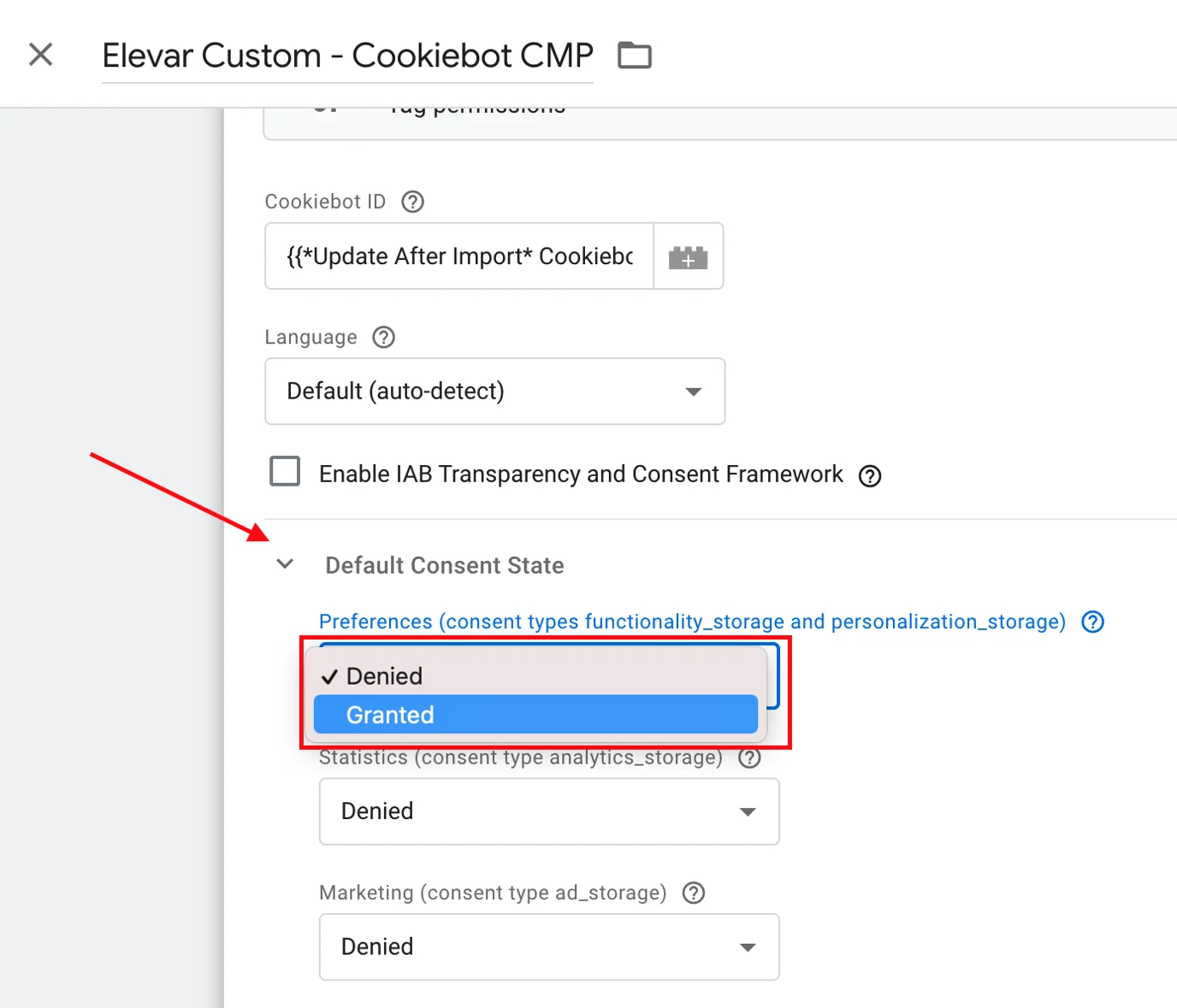 - Navigate to the section titled "Tag Configuration" and select your desired default consent status before the user visitor provides a consent status. Follow this guide to learn what these consent types mean.